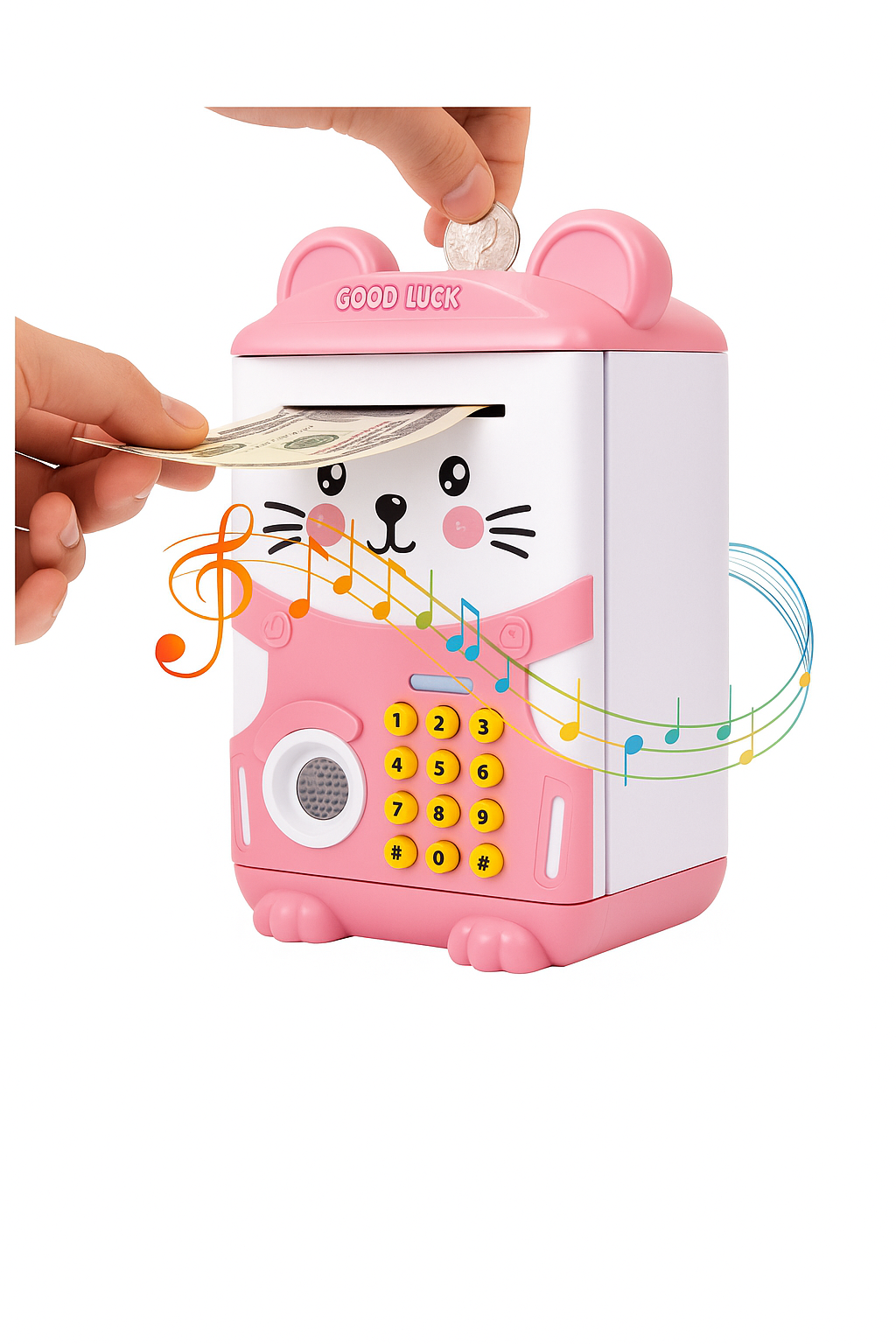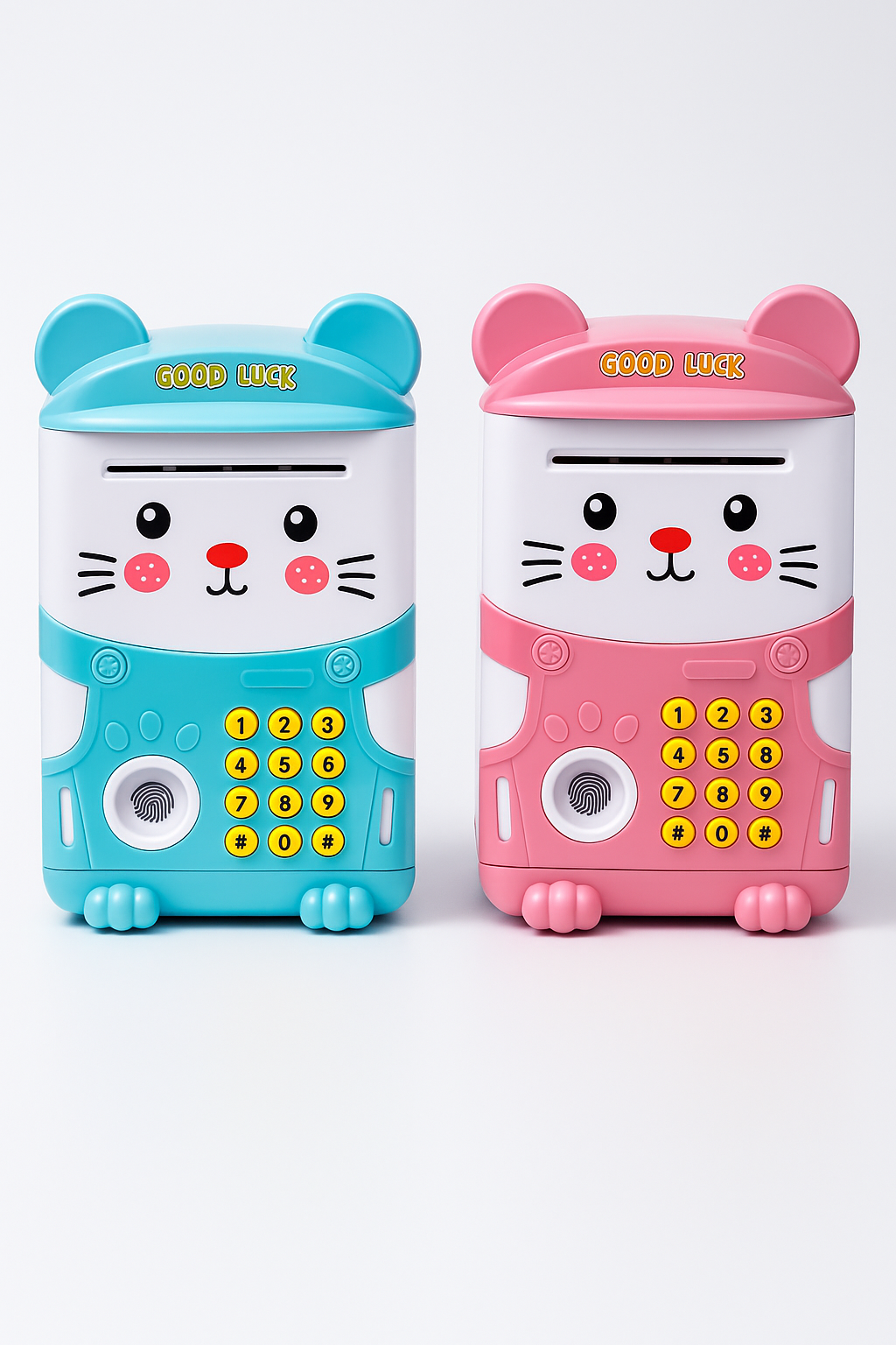Ahorra jugando: depósito automático con música, sensor de huella y contraseña personalizable. Material PVC y colores Azul/Rosa.