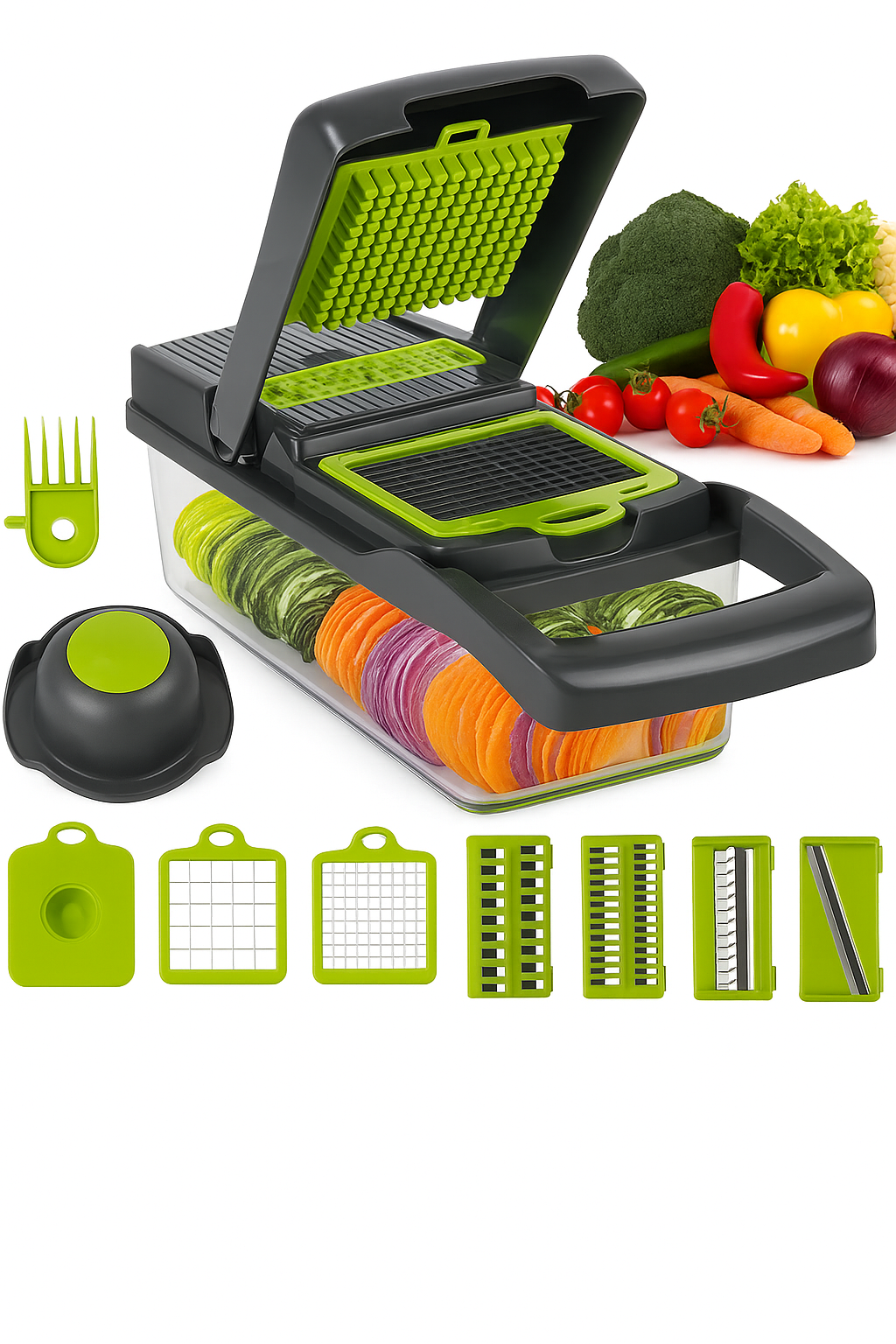 Picador de Verduras 15 en 1 🧅 Multiuso | Rebanar, Rallar & Cubos + Caja